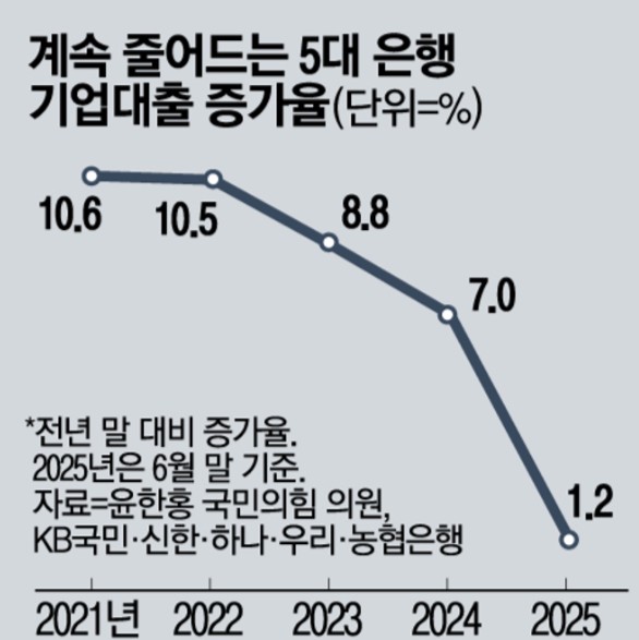 2025년 8월 29일 매일경제가 국회 정무위원장인 윤한홍 국민의힘 의원을 통해 입수한 5대 시중은행(KB국민·신한·하나·우리·NH농협은행) 신용등급별 차주 및 대출 현황 자료에 따르면 2021년과 2022년 5대 은행의 기업대출 잔액은 2년 연속 두 자릿수 증가율을 기록했지만, 2023년과 2024년엔 증가율이 각각 8.8%, 7%로 내리막을 걸었고, 올해의 경우 6월 말까지 증가율이 1.2%에 불과했다.