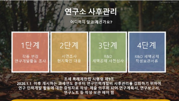 연구소 사후관리 어디까지 알고 계신가요? 페이지 정보 작성자 중소기업인증원 작성일 21-06-22 17:23 본문 연구소 사후관리는 4단계 정도로 나누어 볼 수 있습니다.연구인력개발비 세액공제 신청을 하는 기업이라면 4단계까지 실행을 해야 합니다. 관련링크 https://blog.naver.com/yhbecky 20회 연결 목록